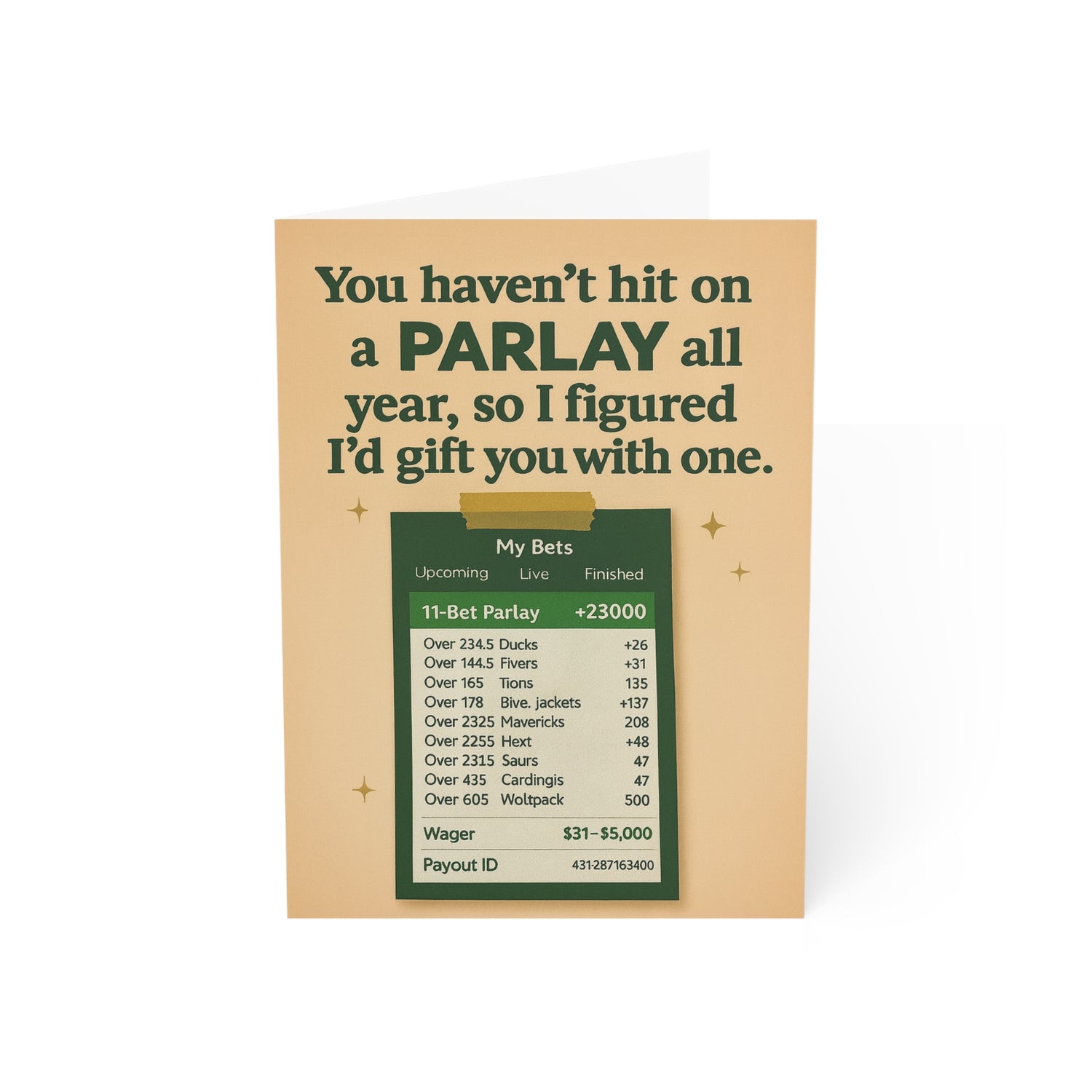 Greeting cards for every occasion. Holidays, jokes, or a parlay missed by...
